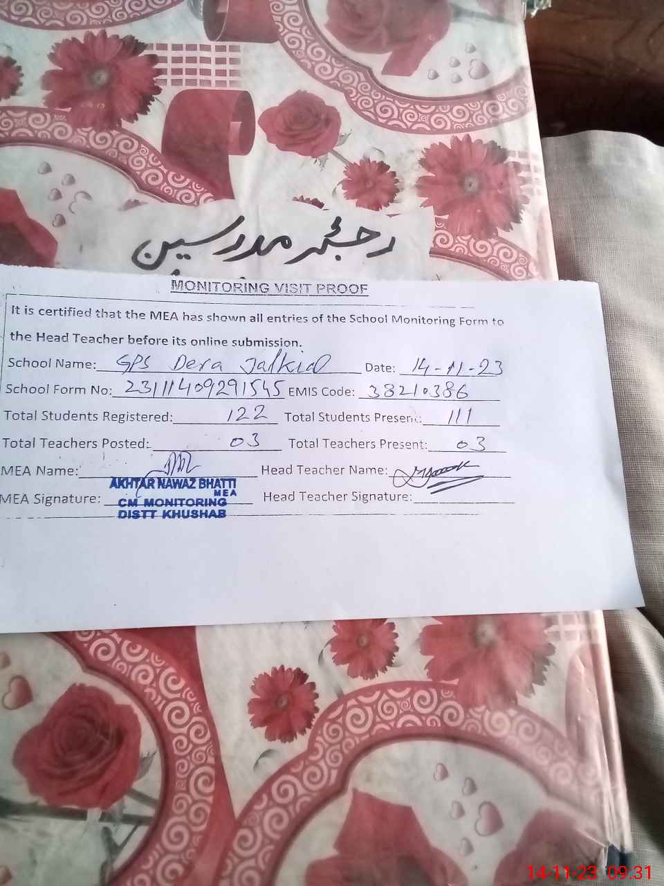 | Attendance Register | Head Teacher | MEA with School | Visit Proof |