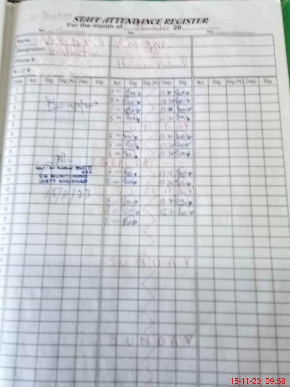 | CNIC | Full Name | Designation | R/C | Absence During Last Calender Month |