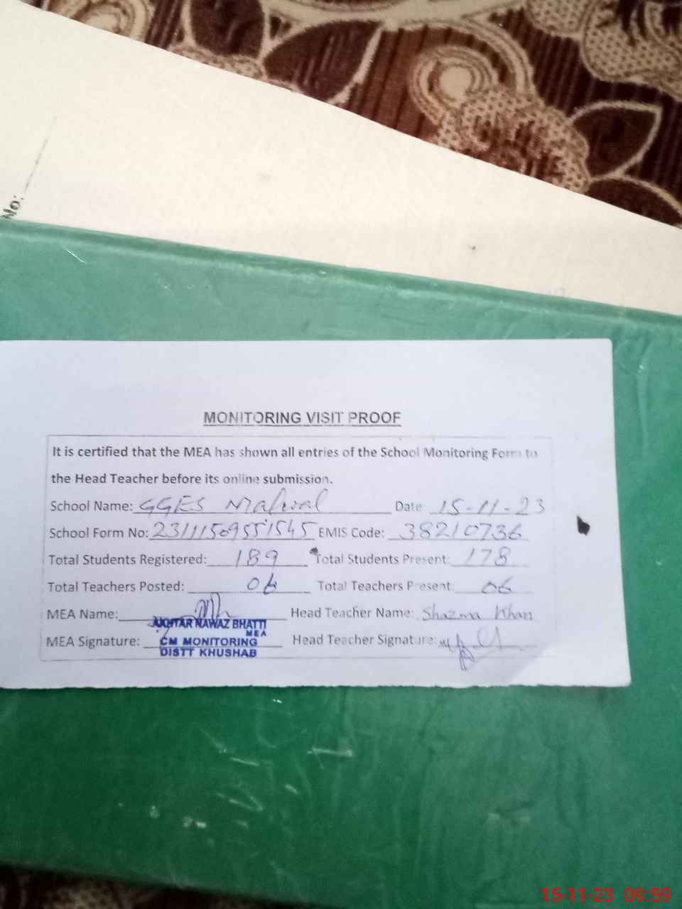 | Attendance Register | Head Teacher | MEA with School | Visit Proof |