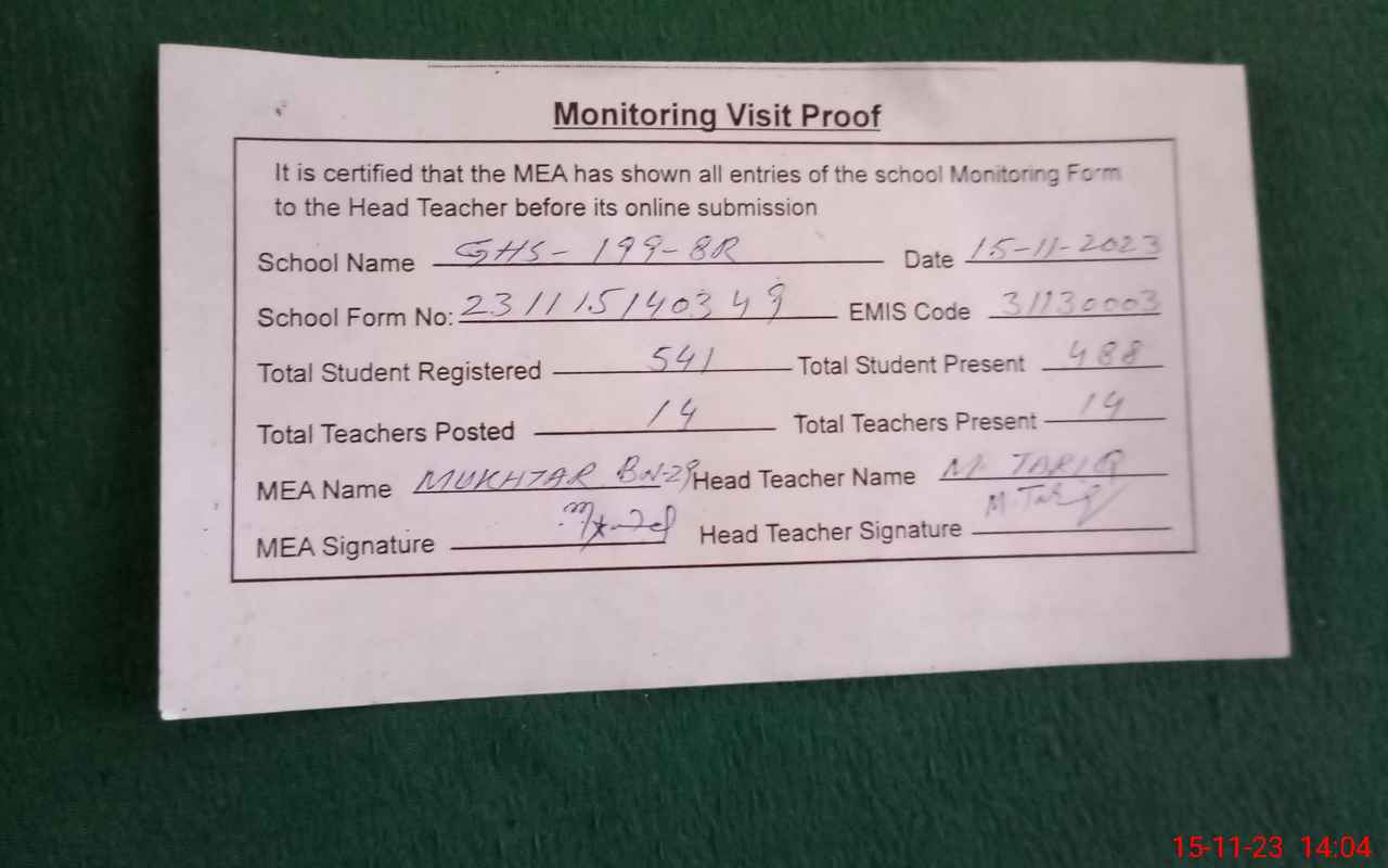 | Attendance Register | Head Teacher | MEA with School | Visit Proof |