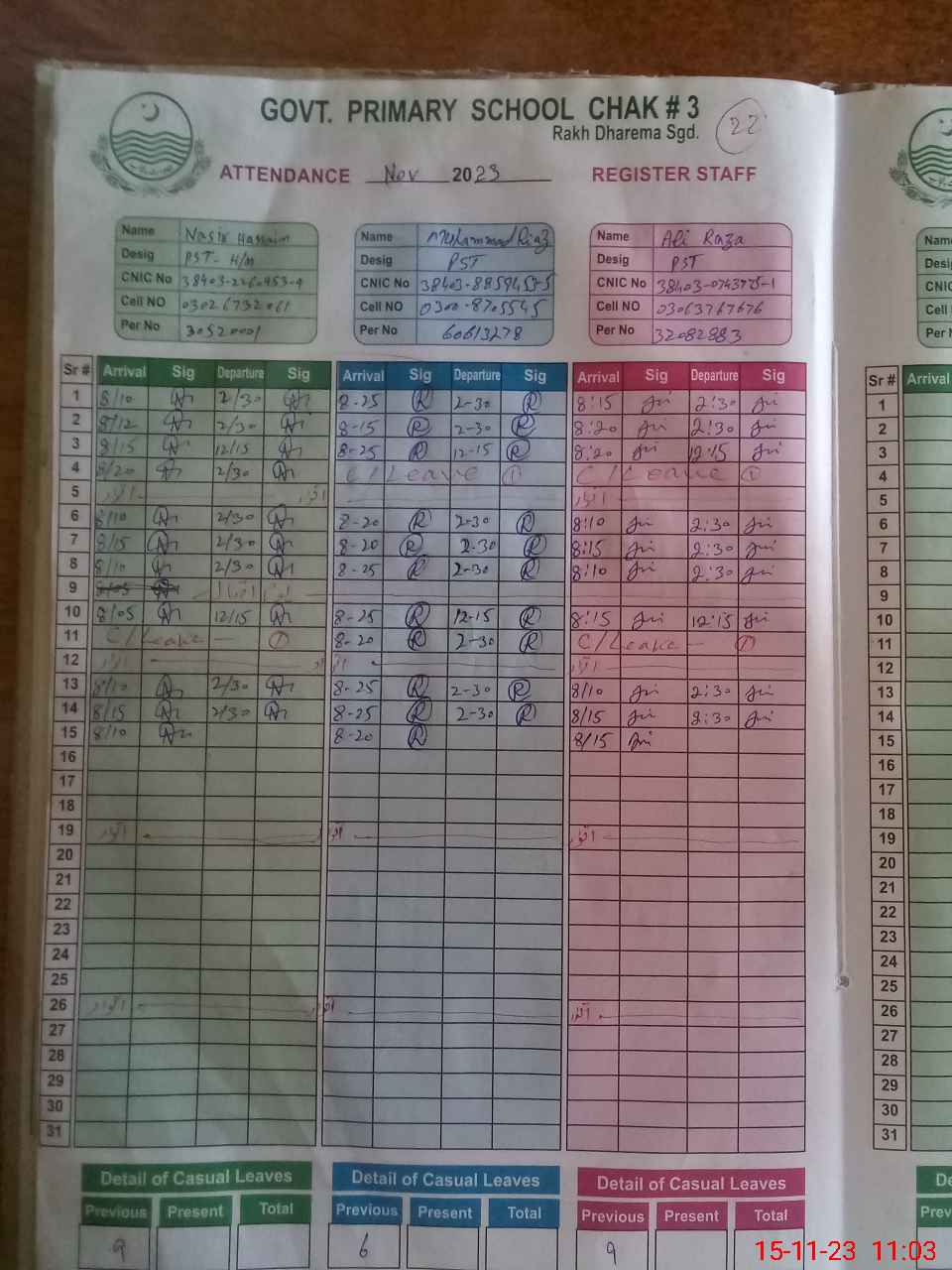 | CNIC | Full Name | Designation | R/C | Absence during last cal. month |