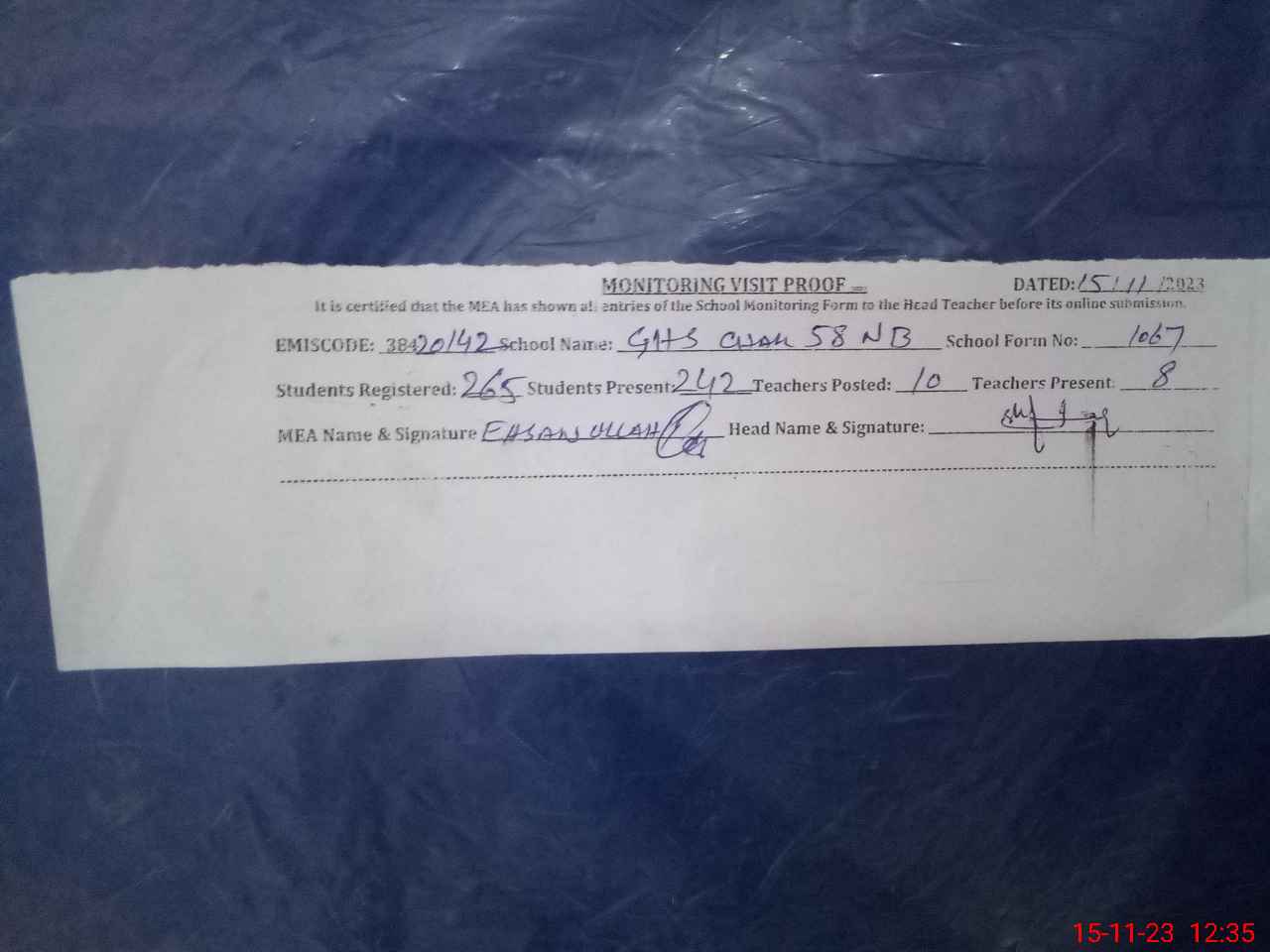| EMIS Code: 38420142 | Name of School: GHS CHAK NO.58 NB | |||