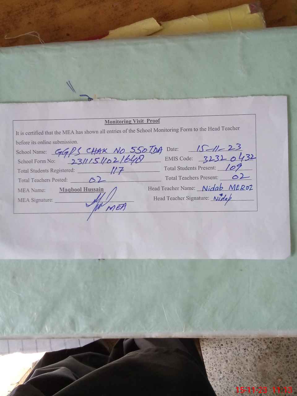 | Attendance Register | Head Teacher | MEA with School | Visit Proof |