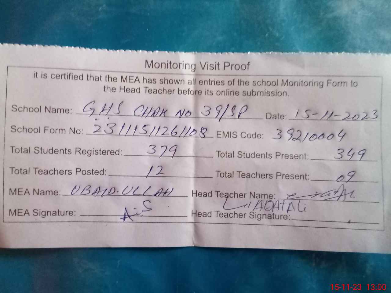| EMIS Code: 39210004 | Name of School: GHS 39/S.P | |||