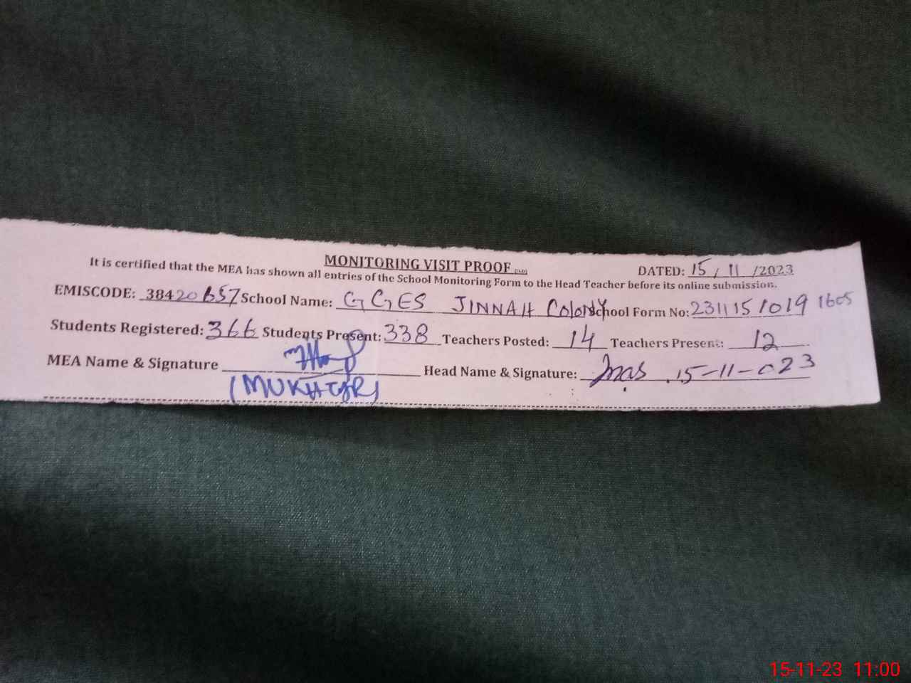 | EMIS Code: 38420657 | Name of School: GGES JINNAH COLONY | |||
