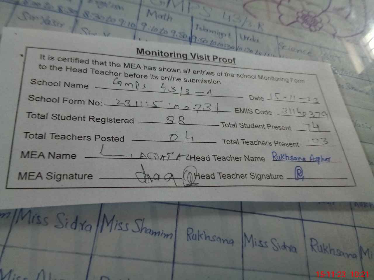 | Attendance Register | Head Teacher | MEA with School | Visit Proof |