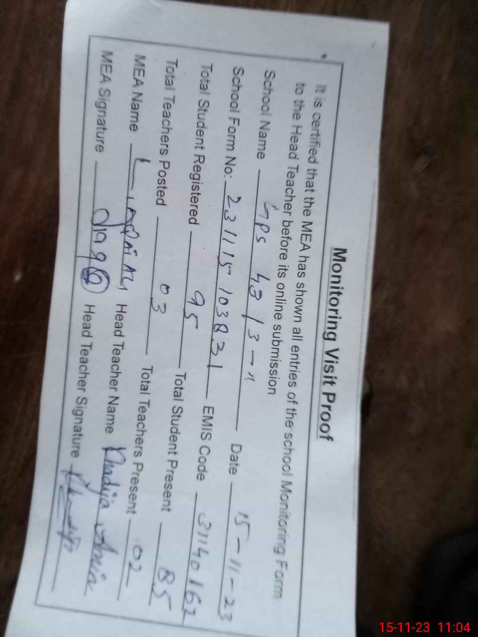 | Attendance Register | Head Teacher | MEA with School | Visit Proof |