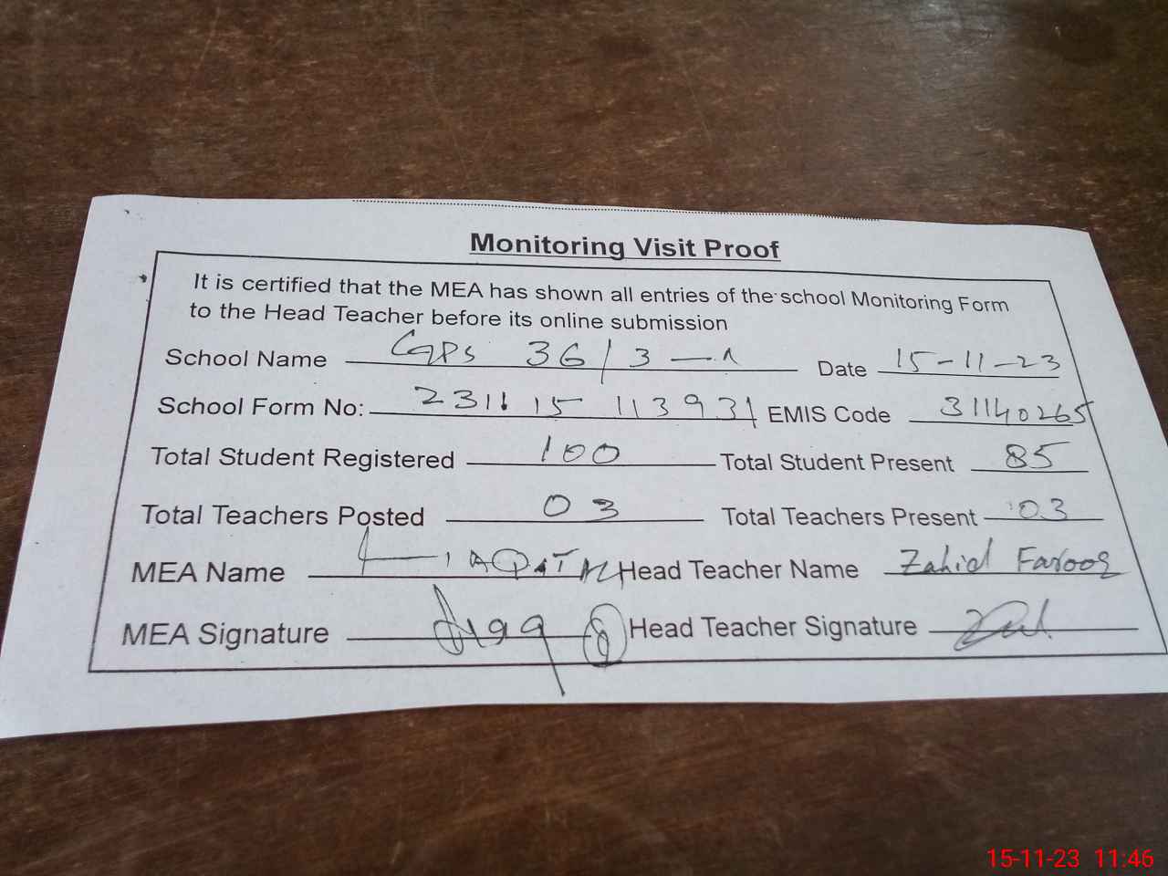 | Attendance Register | Head Teacher | MEA with School | Visit Proof |