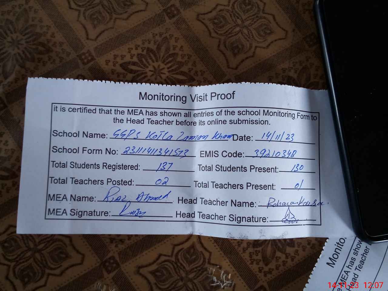 | Attendance Register | Head Teacher | MEA with School | Visit Proof |