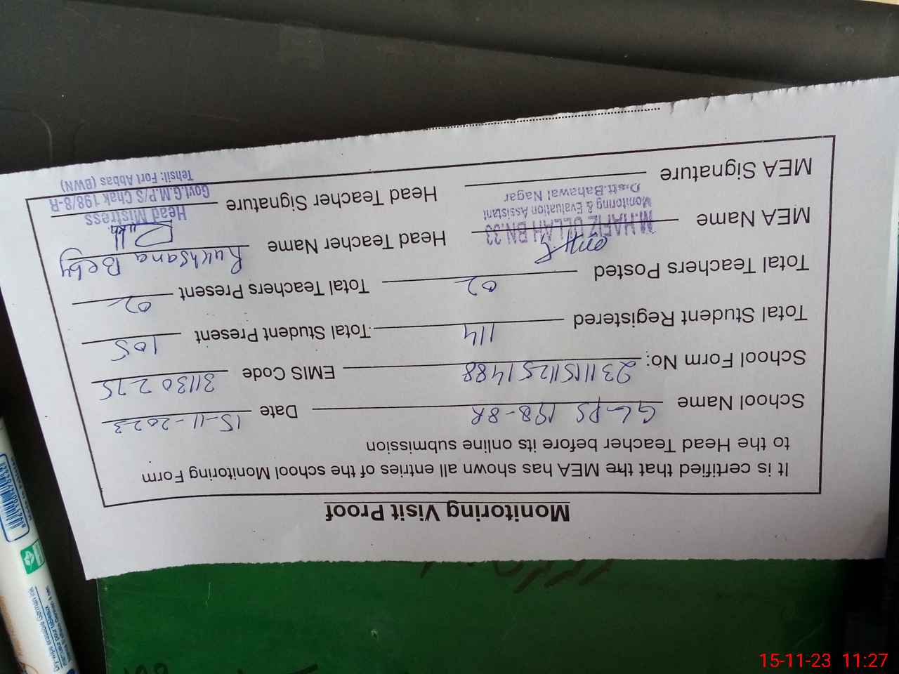 | Attendance Register | Head Teacher | MEA with School | Visit Proof |