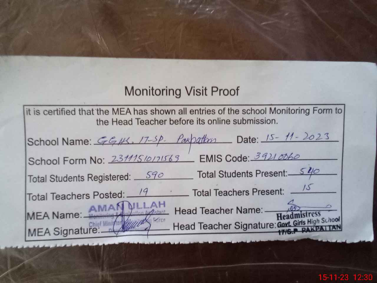 | EMIS Code: 39210060 | Name of School: GGHS 17/SP PAKPATTAN | |||