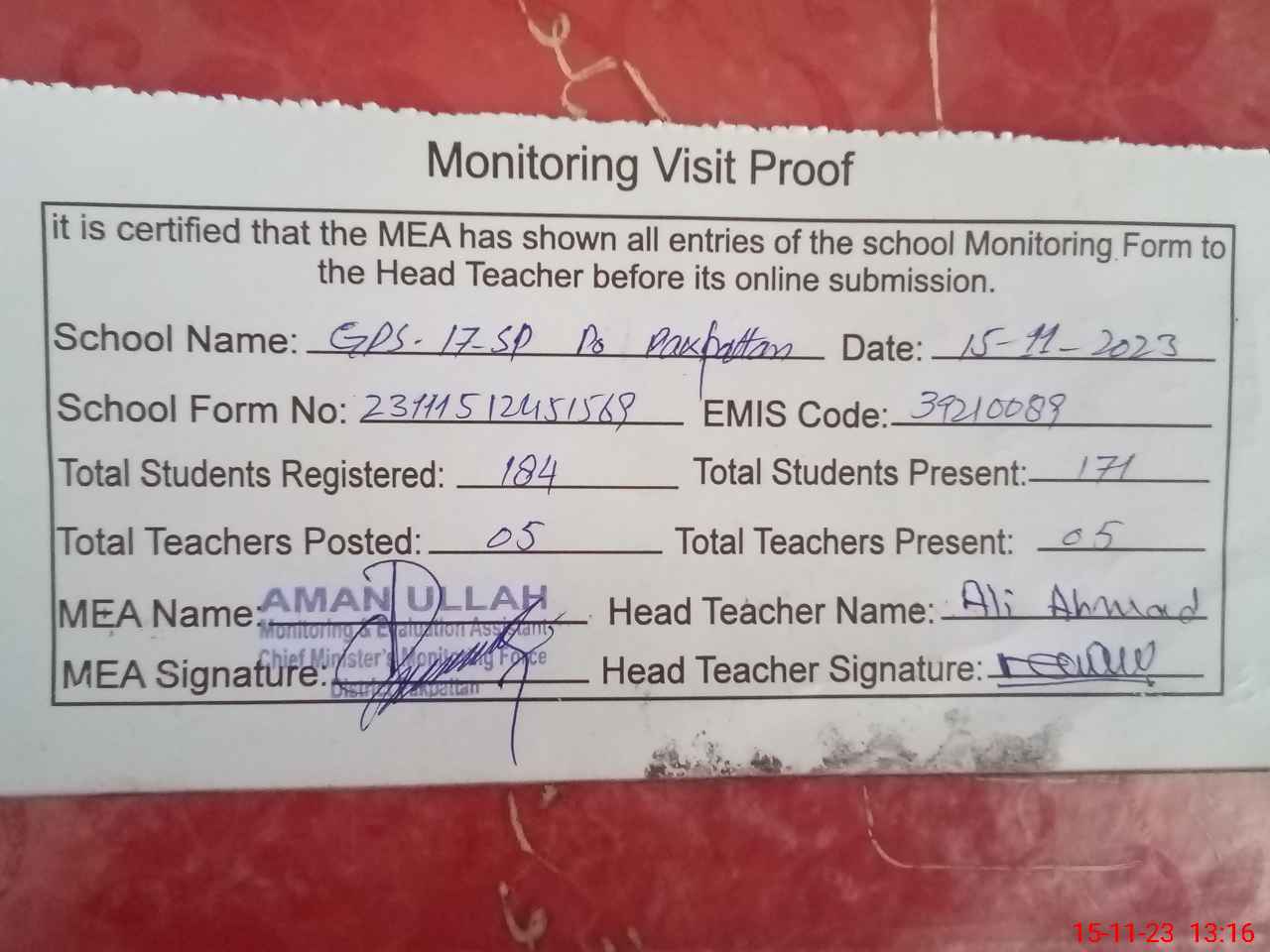 | Attendance Register | Head Teacher | MEA with School | Visit Proof |