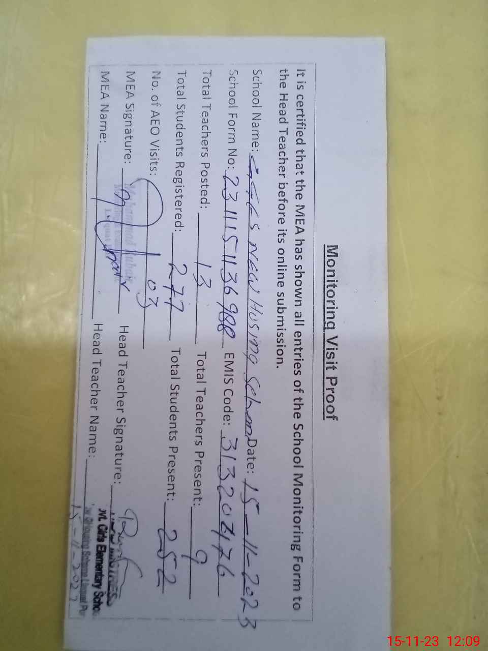 | Attendance Register | Head Teacher | MEA with School | Visit Proof |
