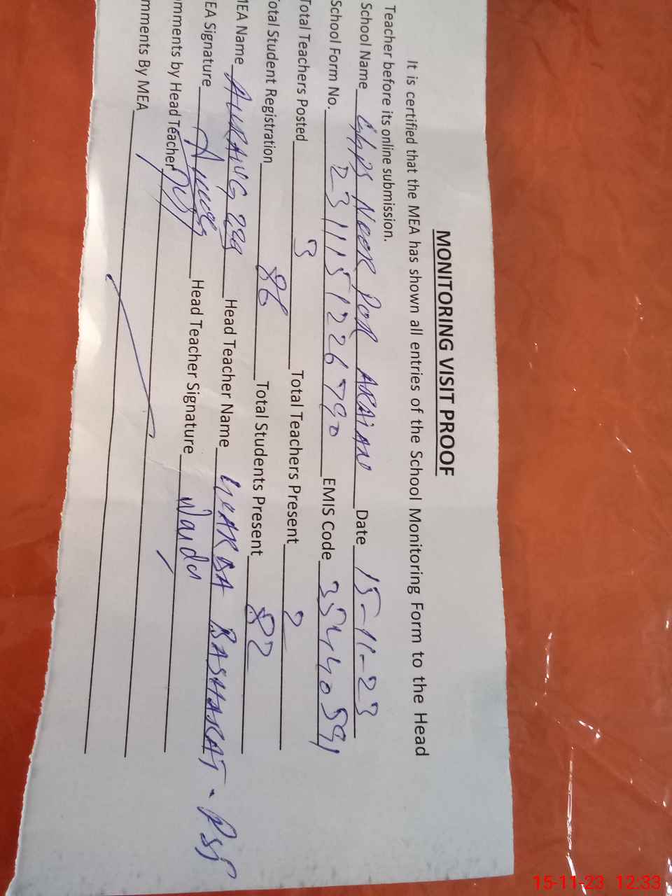 | Attendance Register | Head Teacher | MEA with School | Visit Proof |