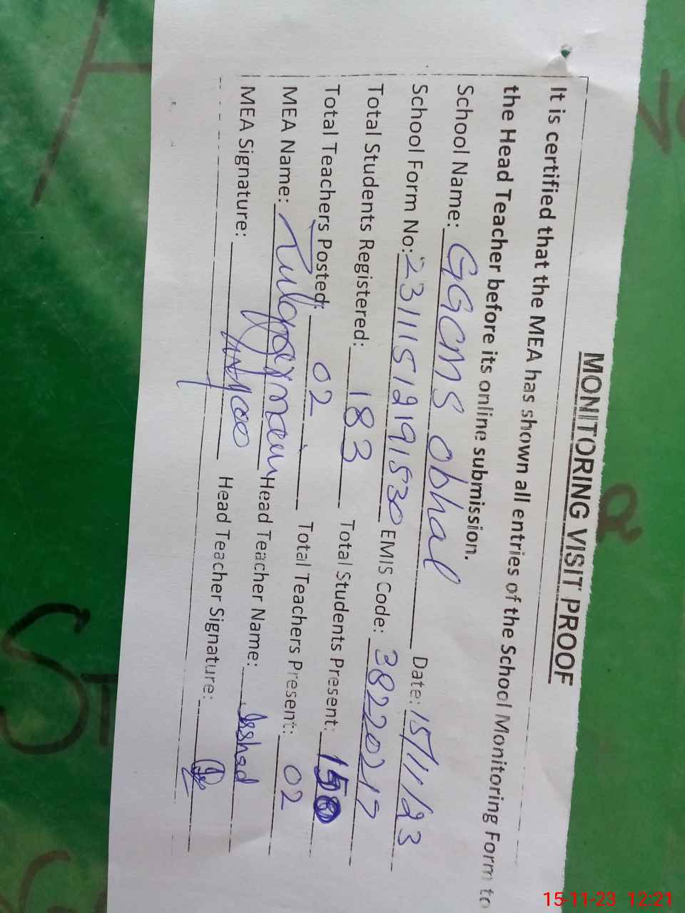 | Attendance Register | Head Teacher | MEA with School | Visit Proof |