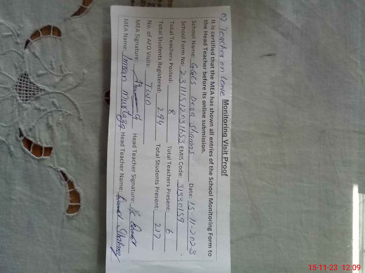 | Attendance Register | Head Teacher | MEA with School | Visit Proof |