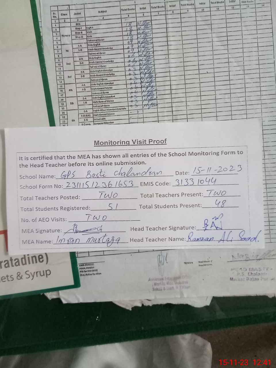 | Attendance Register | Head Teacher | MEA with School | Visit Proof |