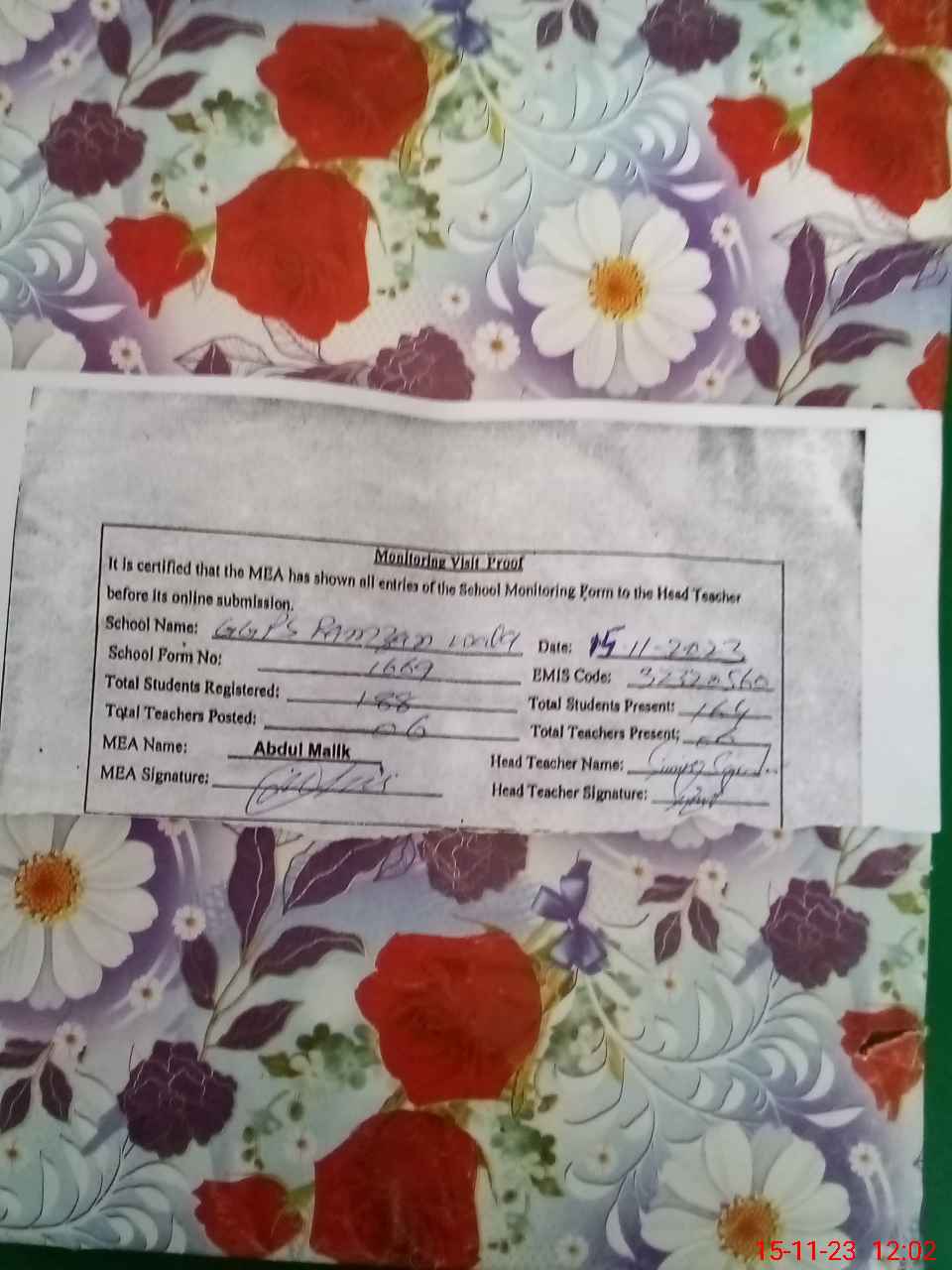 | Attendance Register | Head Teacher | MEA with School | Visit Proof |