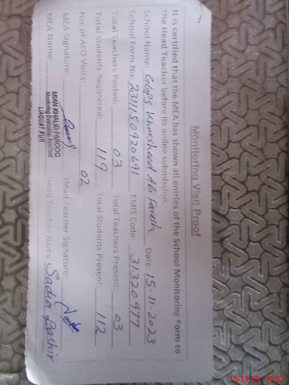| Monitoring Date: 15-11-2023 | Start Time: 15-11-2023 08:42 AM | End Time: 15-11-2023 09:22 AM | Name of MEA: Kh**** Fa**** | |