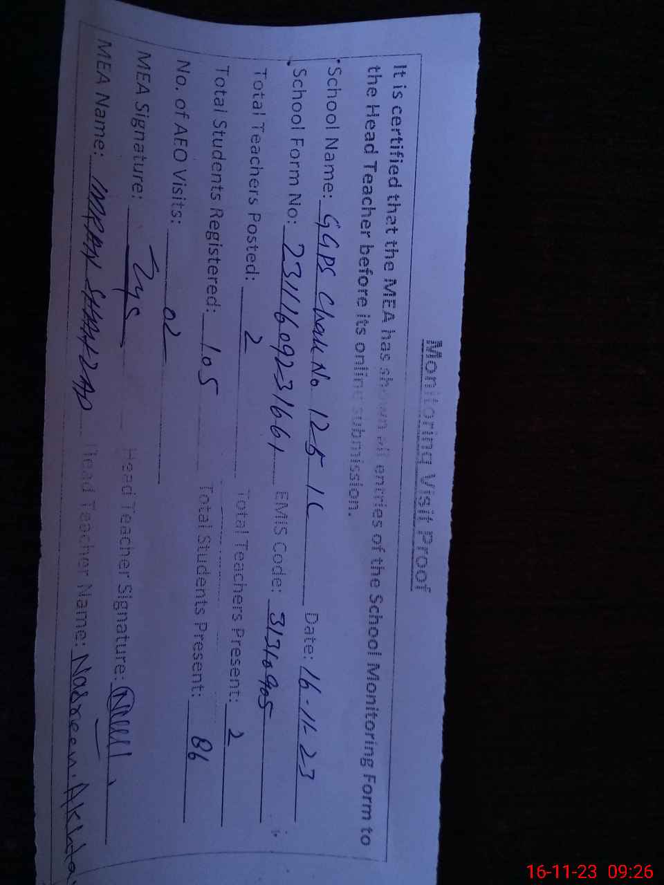 | Attendance Register | Head Teacher | MEA with School | Visit Proof |