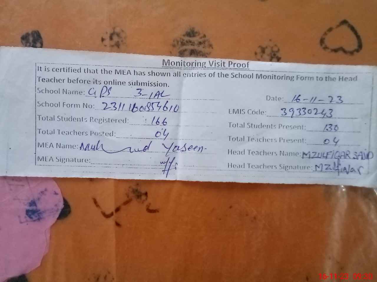| Attendance Register | Head Teacher | MEA with School | Visit Proof |
