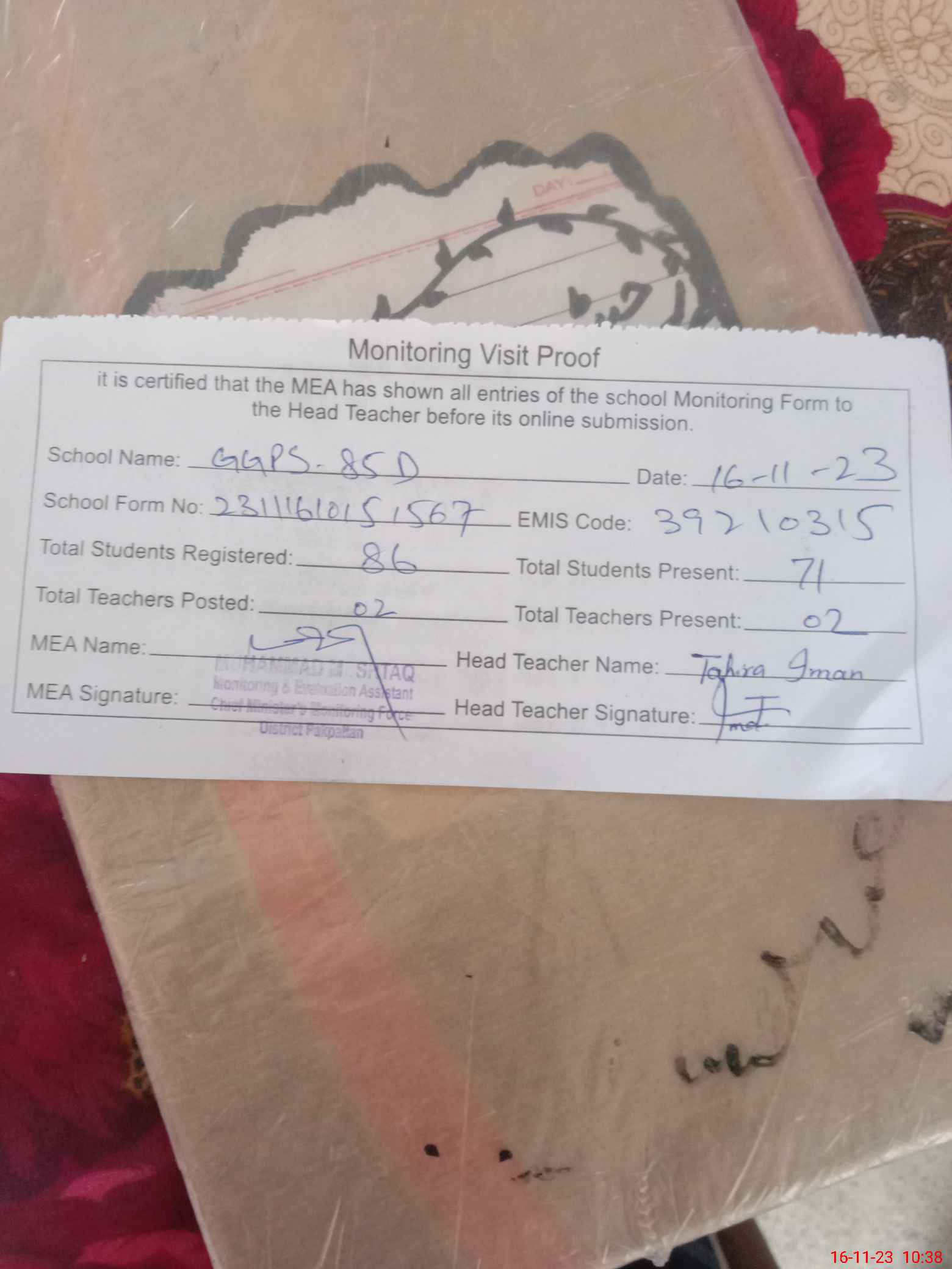 | Attendance Register | Head Teacher | MEA with School | Visit Proof |