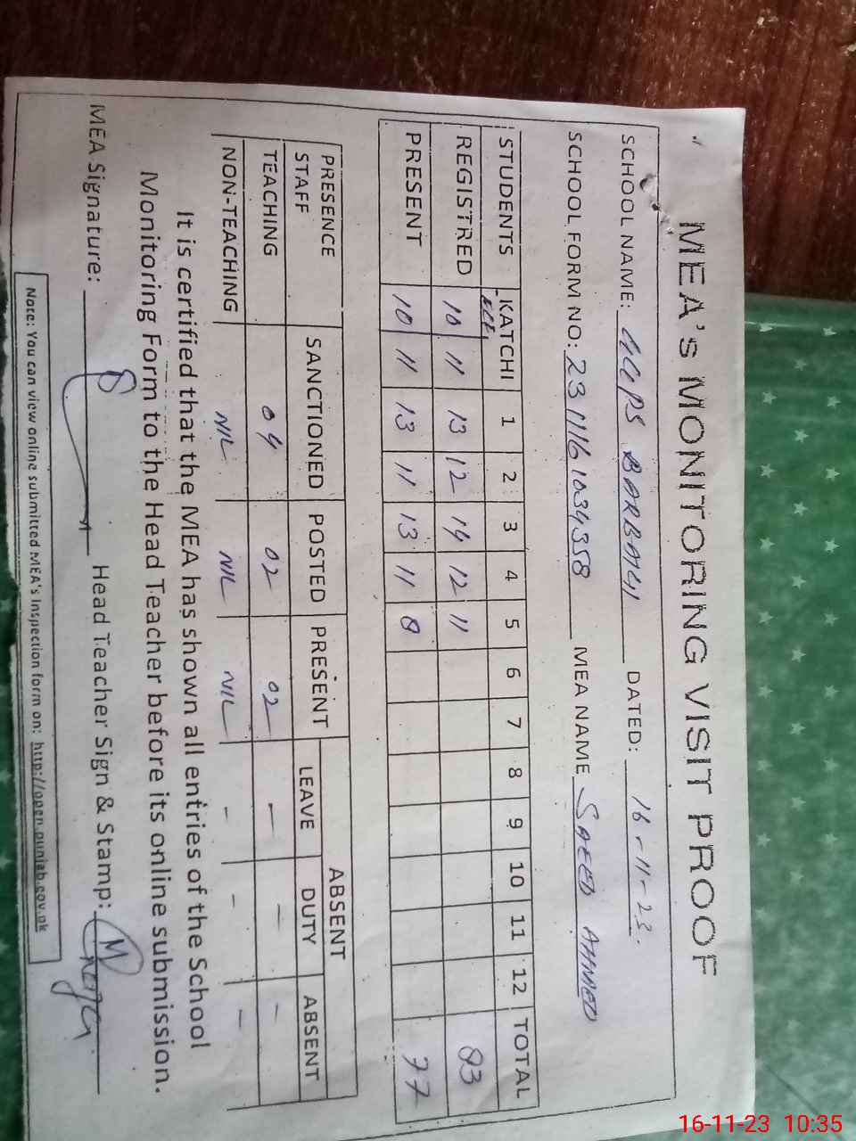 | Attendance Register | Head Teacher | MEA with School | Visit Proof |