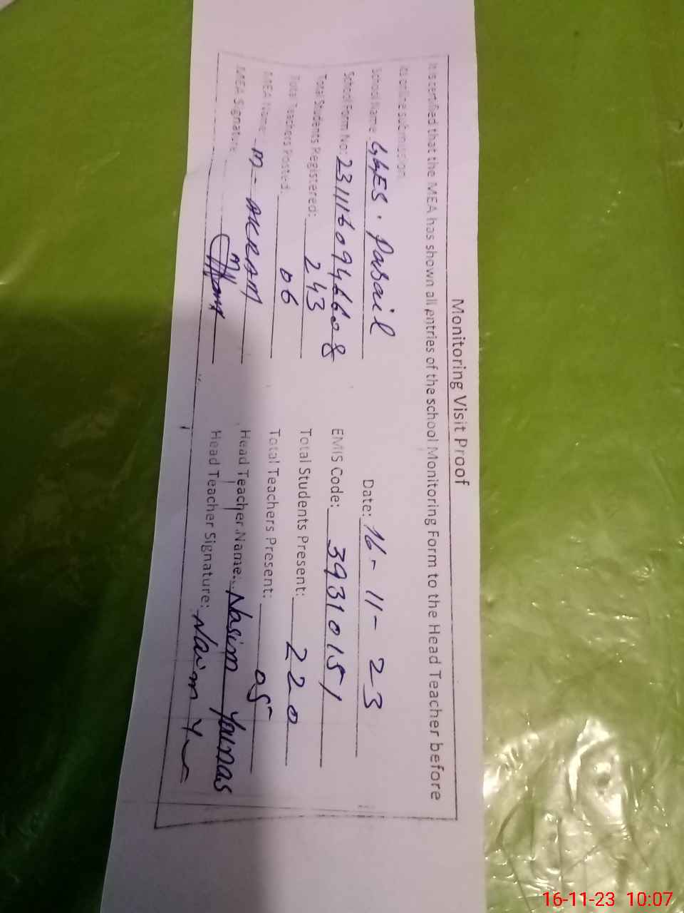 | Attendance Register | Head Teacher | MEA with School | Visit Proof |