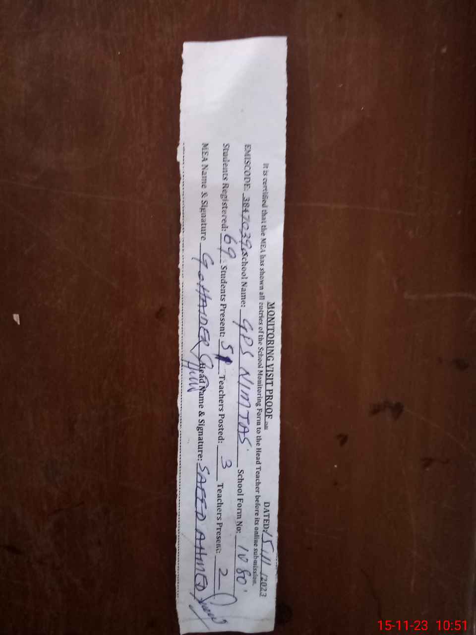 | Monitoring Date: 15-11-2023 | Start Time: 15-11-2023 10:10 AM | End Time: 15-11-2023 10:53 AM | Name of MEA: GH**** HA**** | |