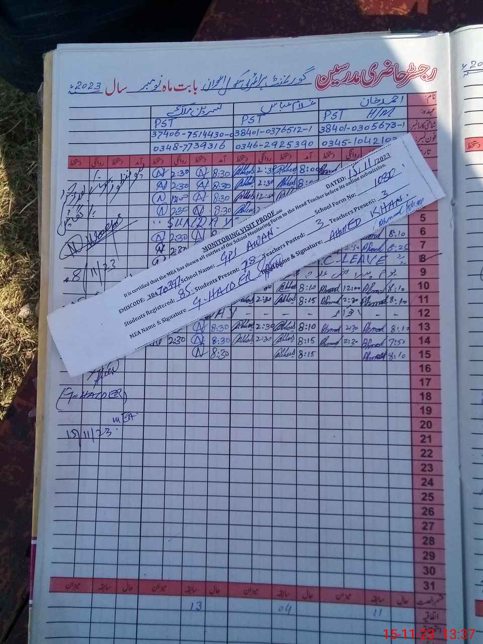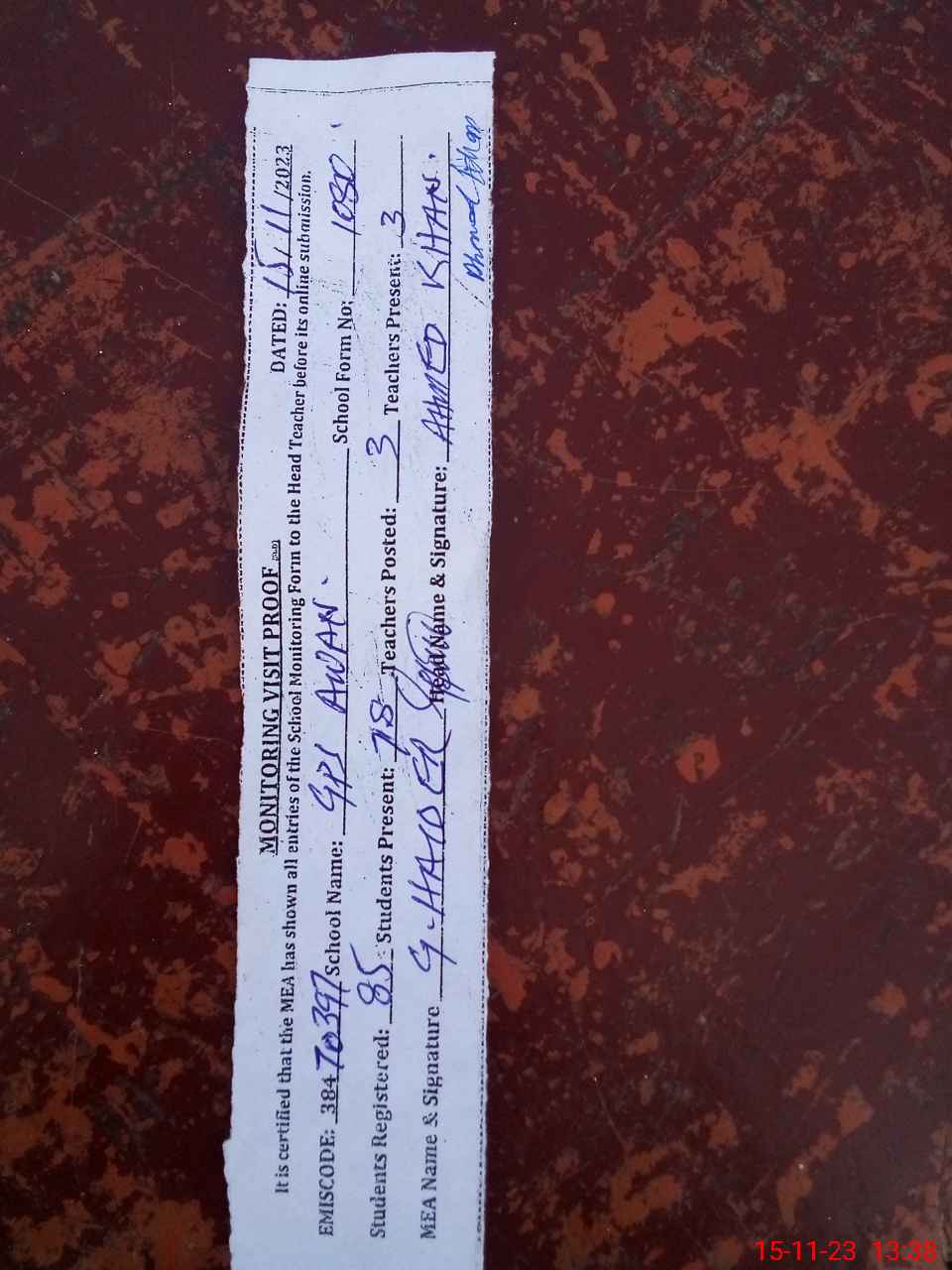 | Attendance Register | Head Teacher | MEA with School | Visit Proof |