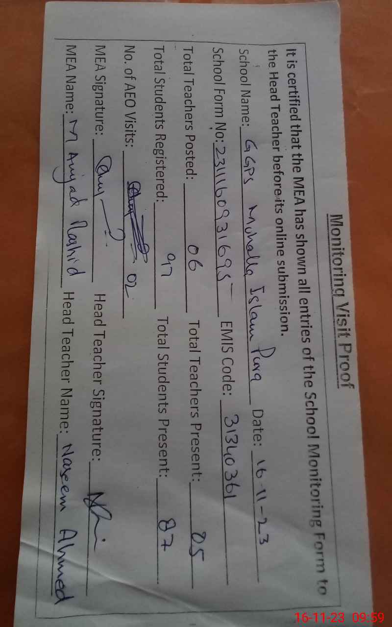 | EMIS Code: 31340361 | Name of School: GGPS MOHALLA ISLAM PURA | |||