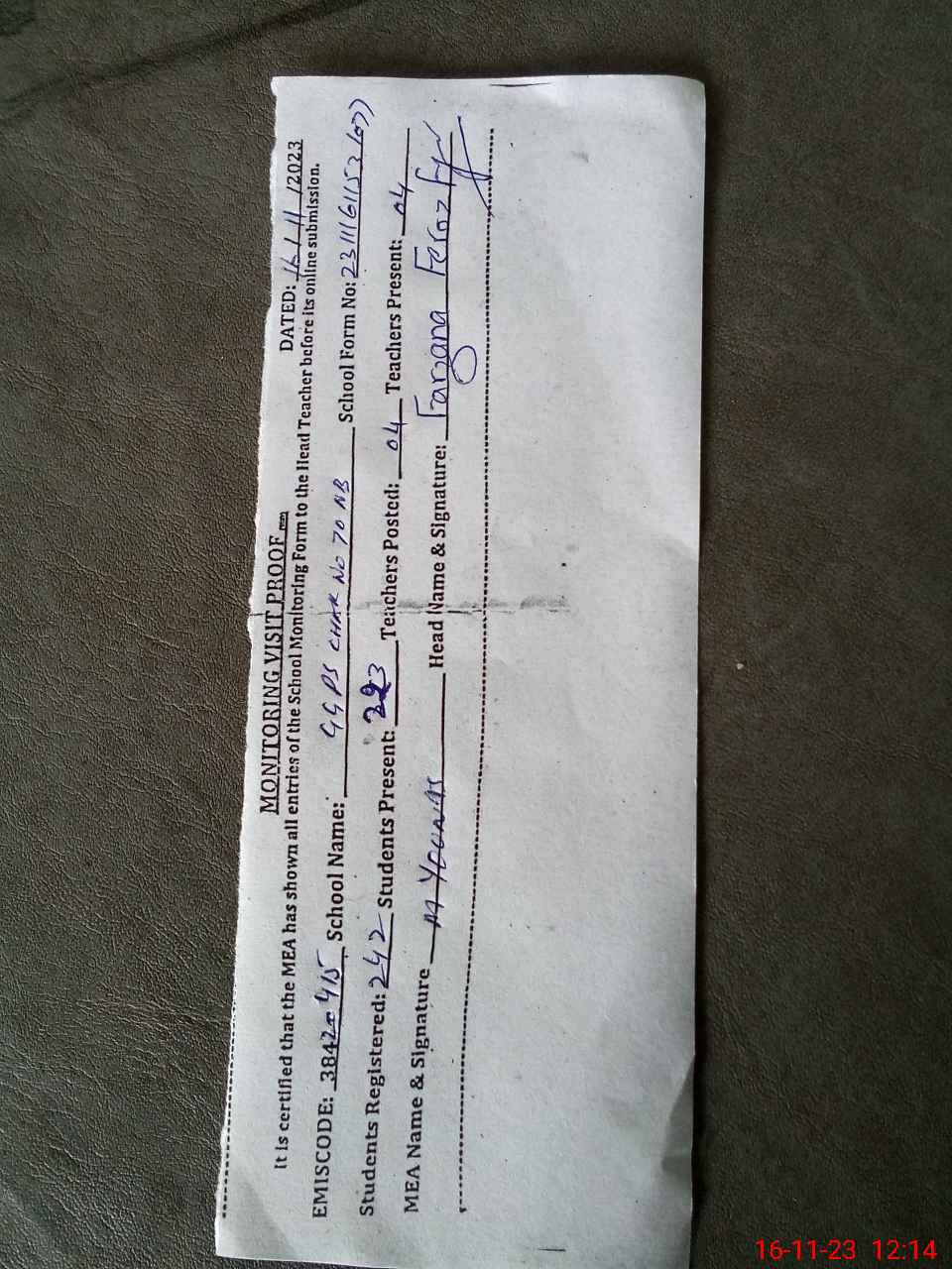 | Attendance Register | Head Teacher | MEA with School | Visit Proof |