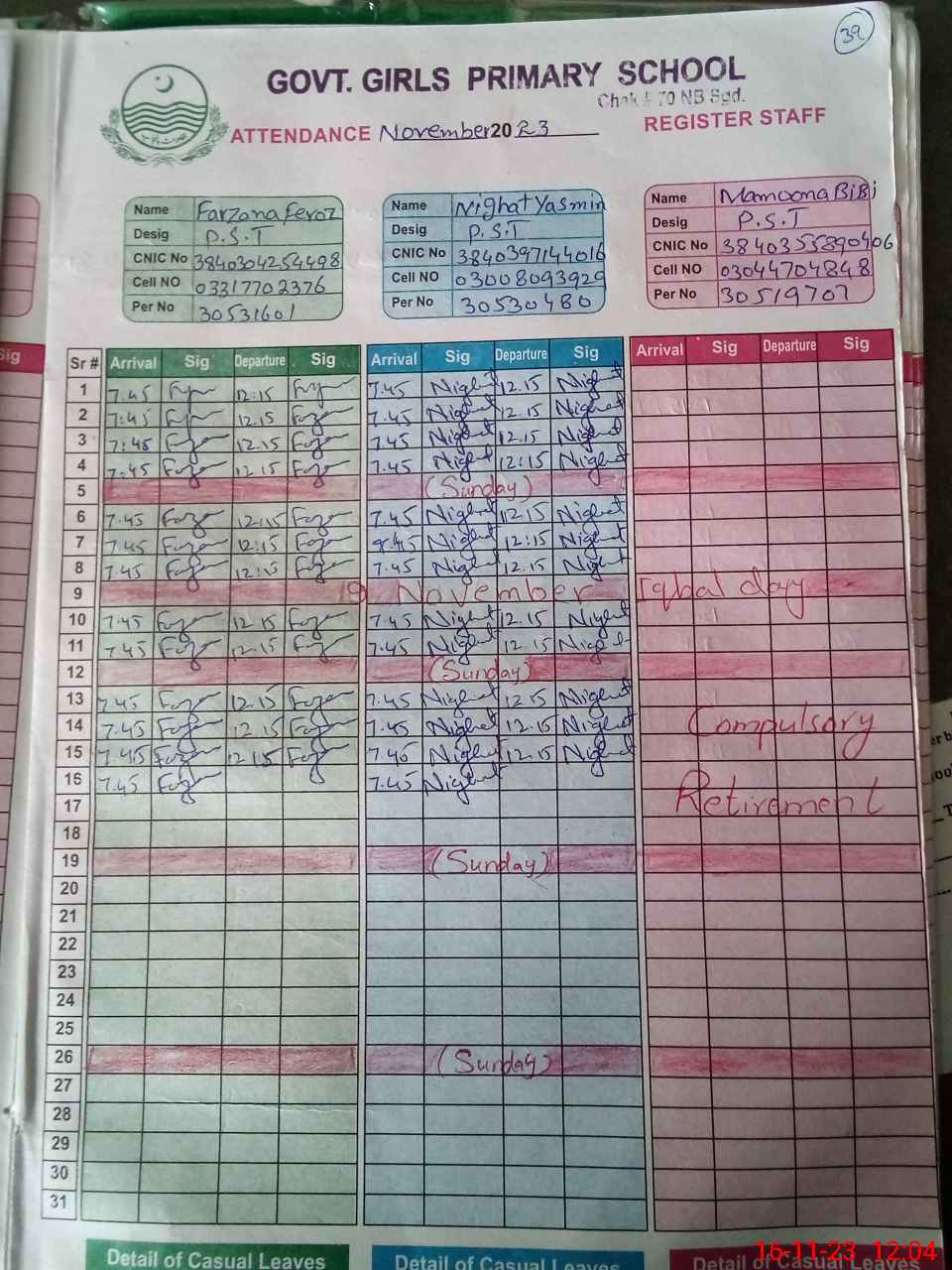 | CNIC | Full Name | Designation | R/C | Absence During Last Calender Month |