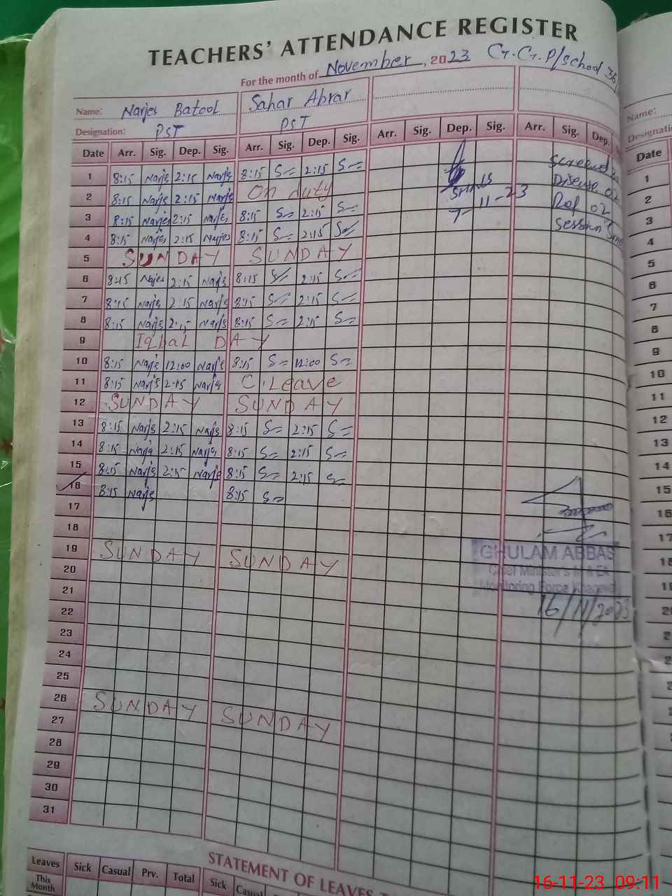 | CNIC | Full Name | Designation | R/C | Absence During Last Calender Month |