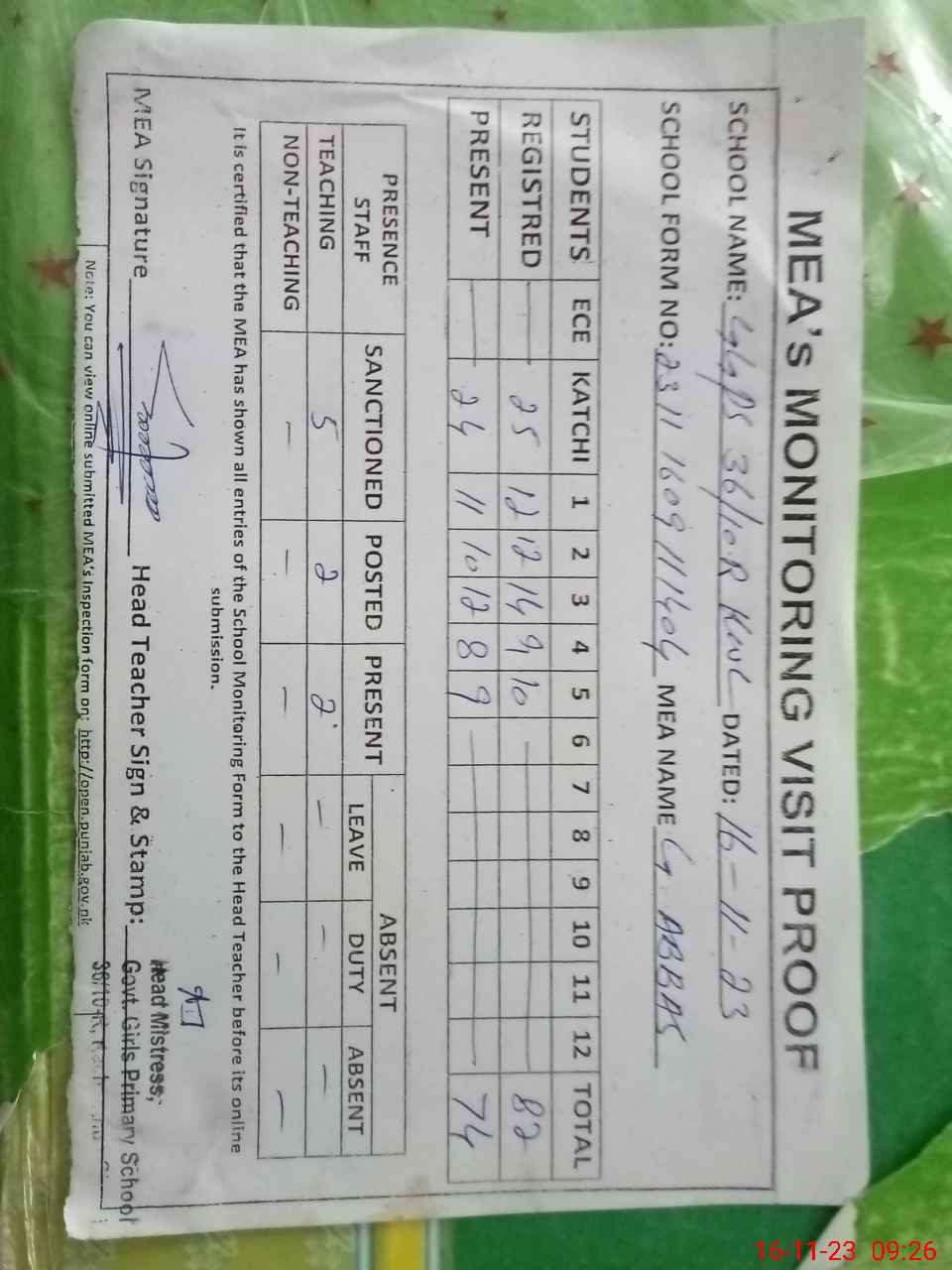 | Attendance Register | Head Teacher | MEA with School | Visit Proof |