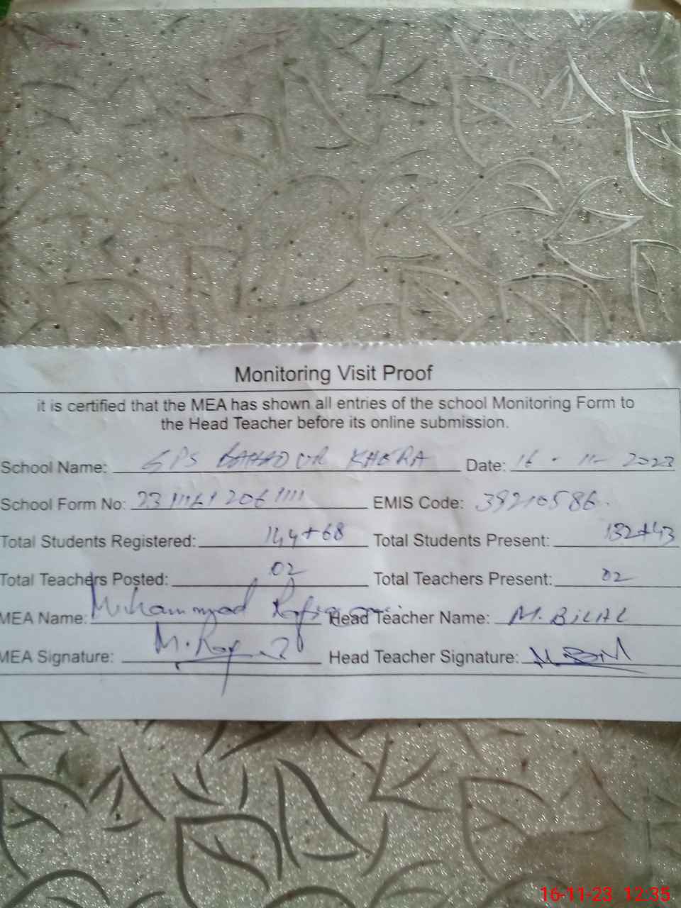 | Attendance Register | Head Teacher | MEA with School | Visit Proof |