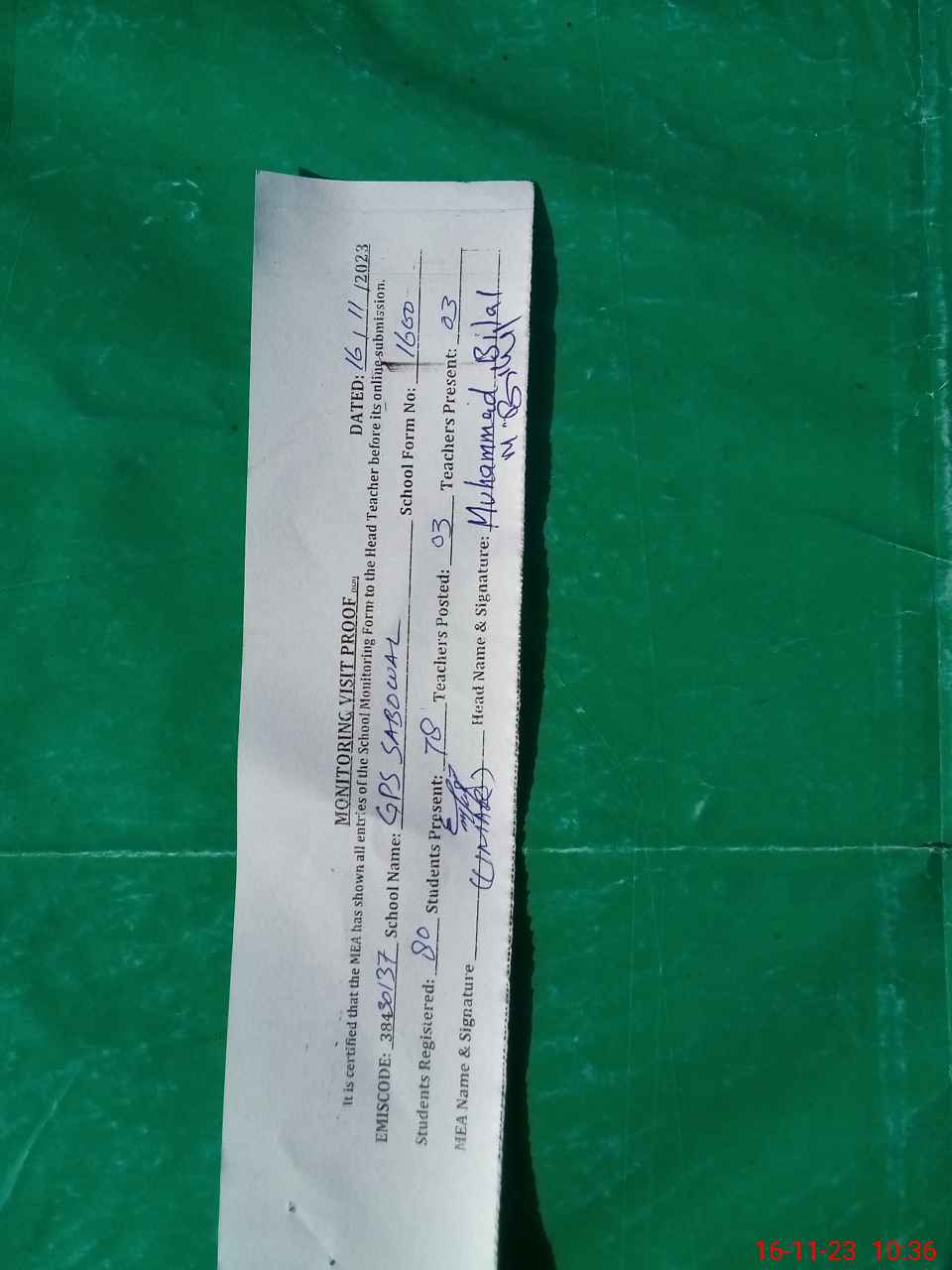 | Attendance Register | Head Teacher | MEA with School | Visit Proof |