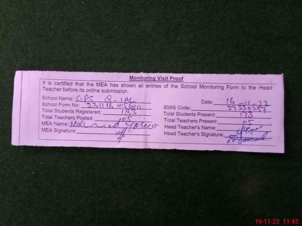 | Attendance Register | Head Teacher | MEA with School | Visit Proof |