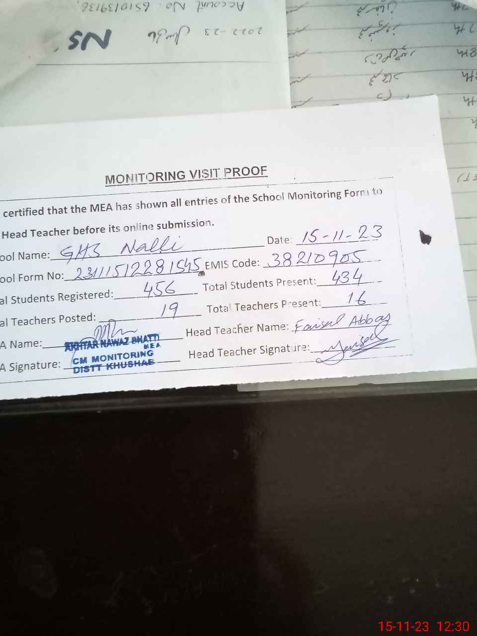 | Monitoring Date: 15-11-2023 | Start Time: 15-11-2023 12:00 PM | End Time: 15-11-2023 12:30 PM | Name of MEA: AK**** NA**** (R**** | |