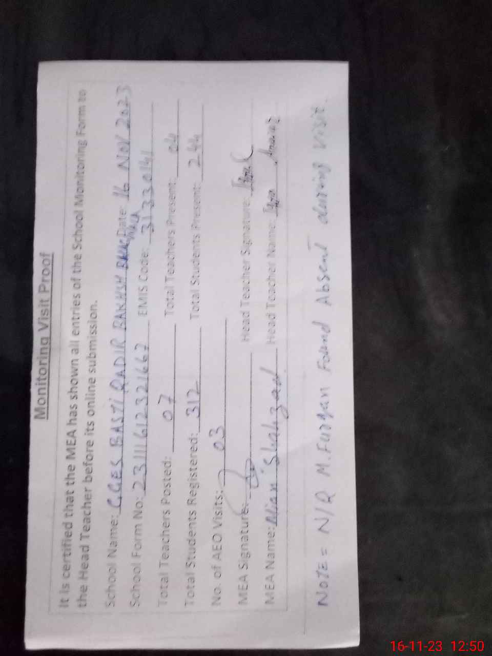 | Attendance Register | Head Teacher | MEA with School | Visit Proof |