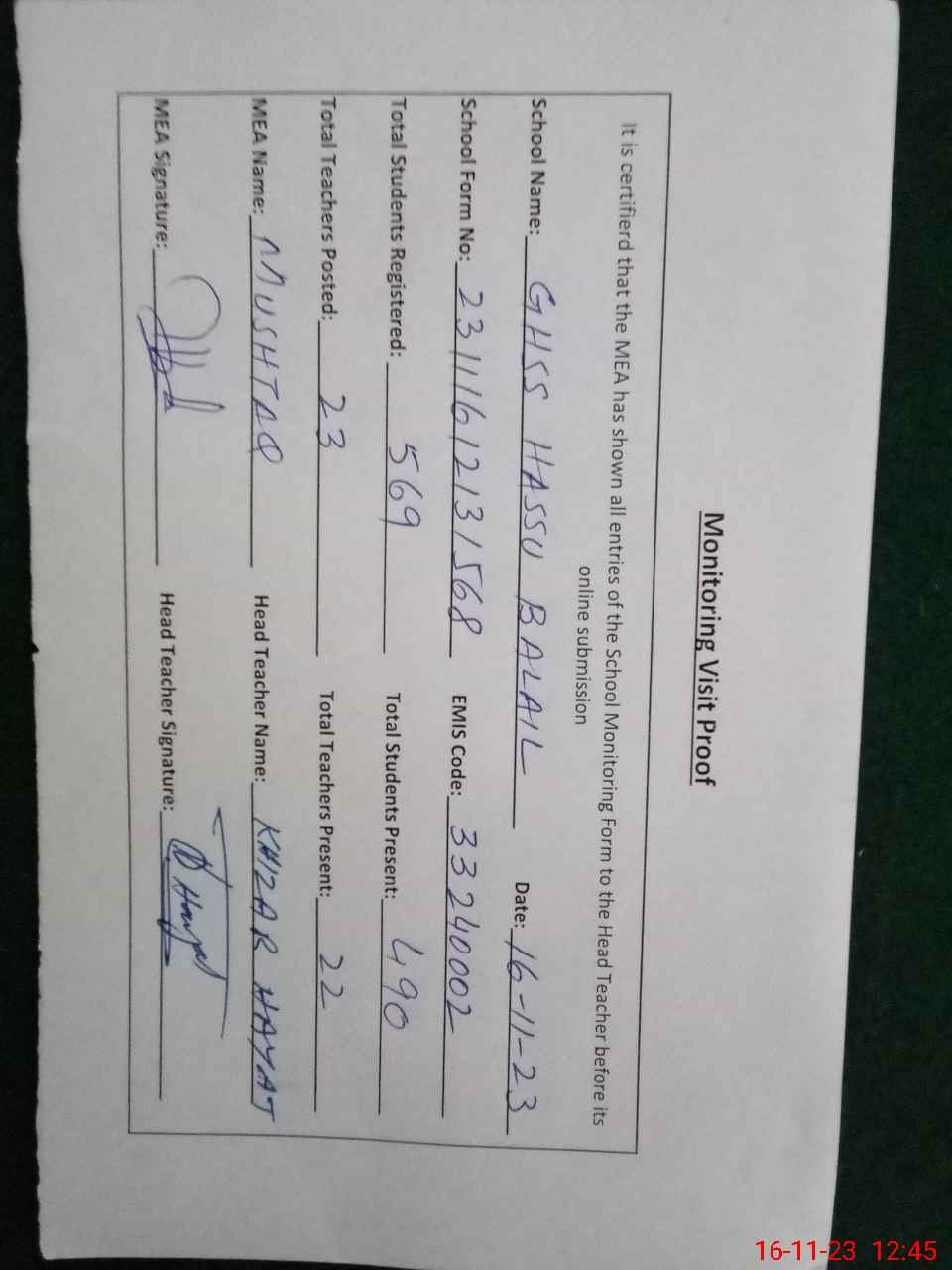 | Attendance Register | Head Teacher | MEA with School | Visit Proof |