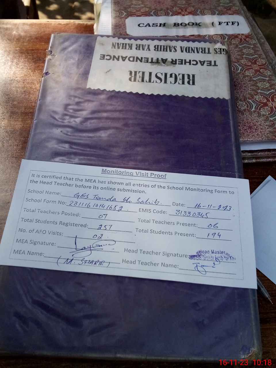 | Attendance Register | Head Teacher | MEA with School | Visit Proof |