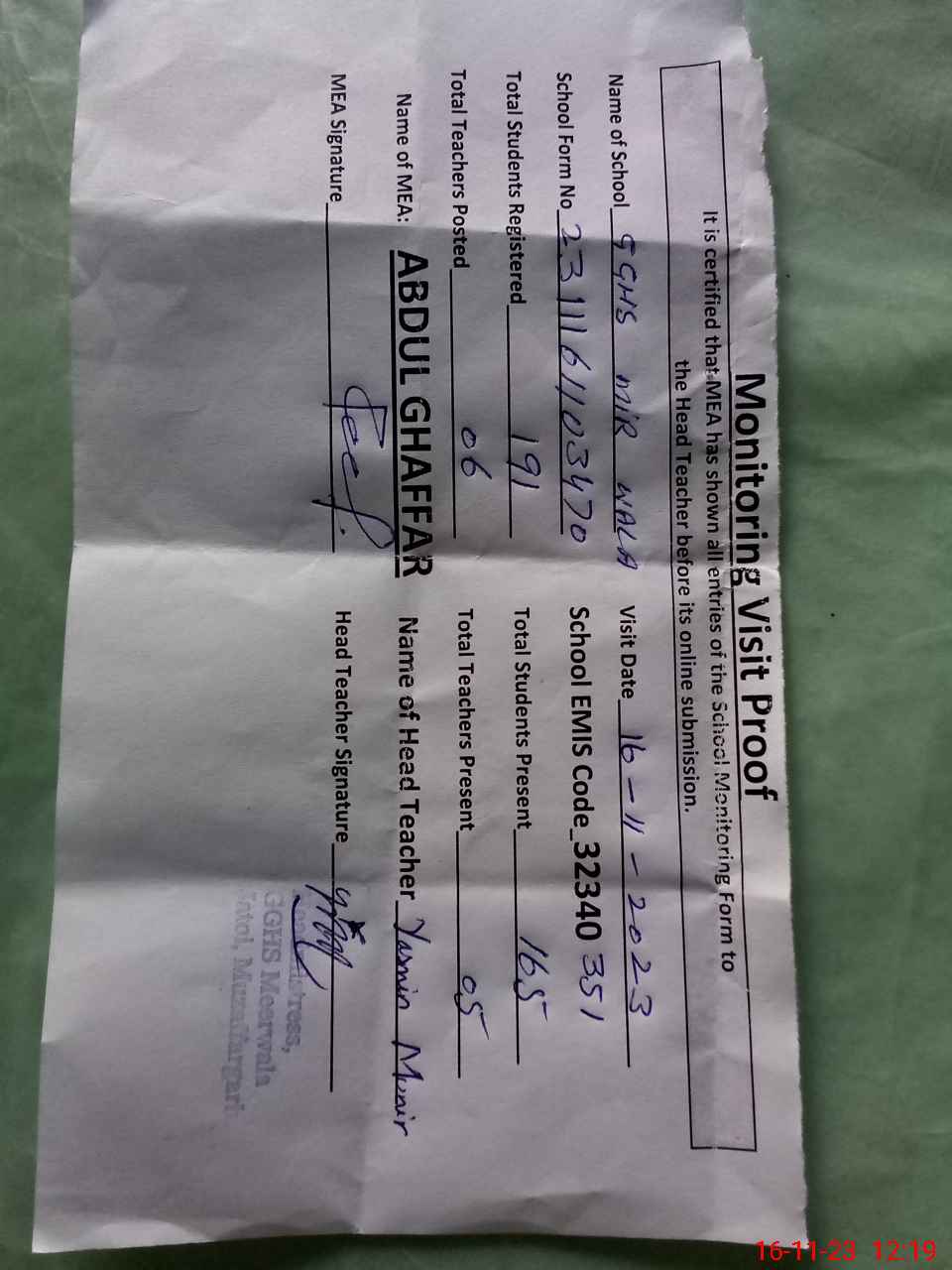 | EMIS Code: 32340351 | Name of School: GGHS MEER WALA | |||