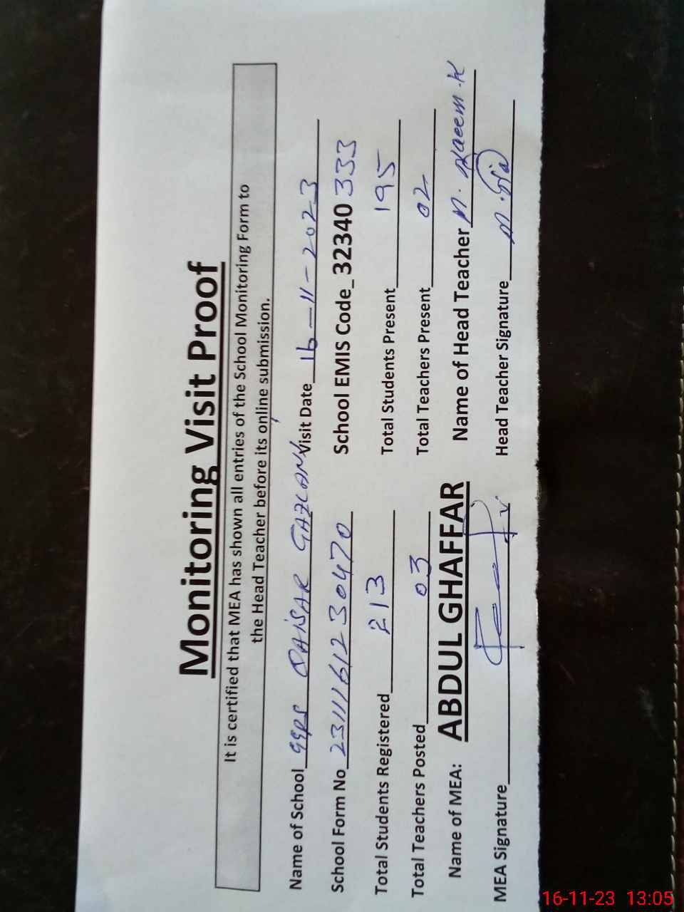 | Attendance Register | Head Teacher | MEA with School | Visit Proof |