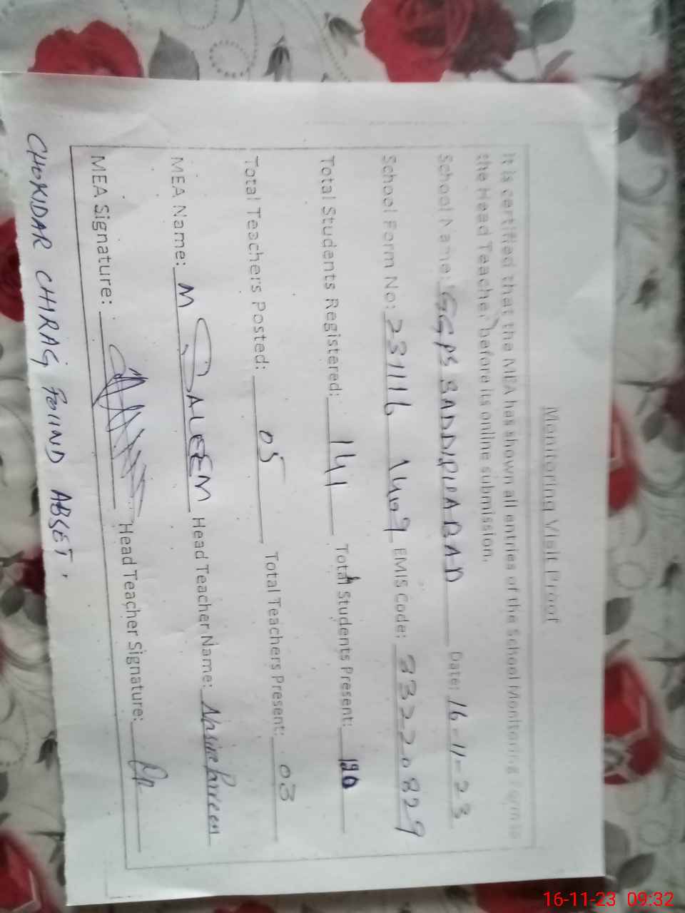 | EMIS Code: 33220829 | Name of School: GGPS SIDDIQUE ABAD | |||