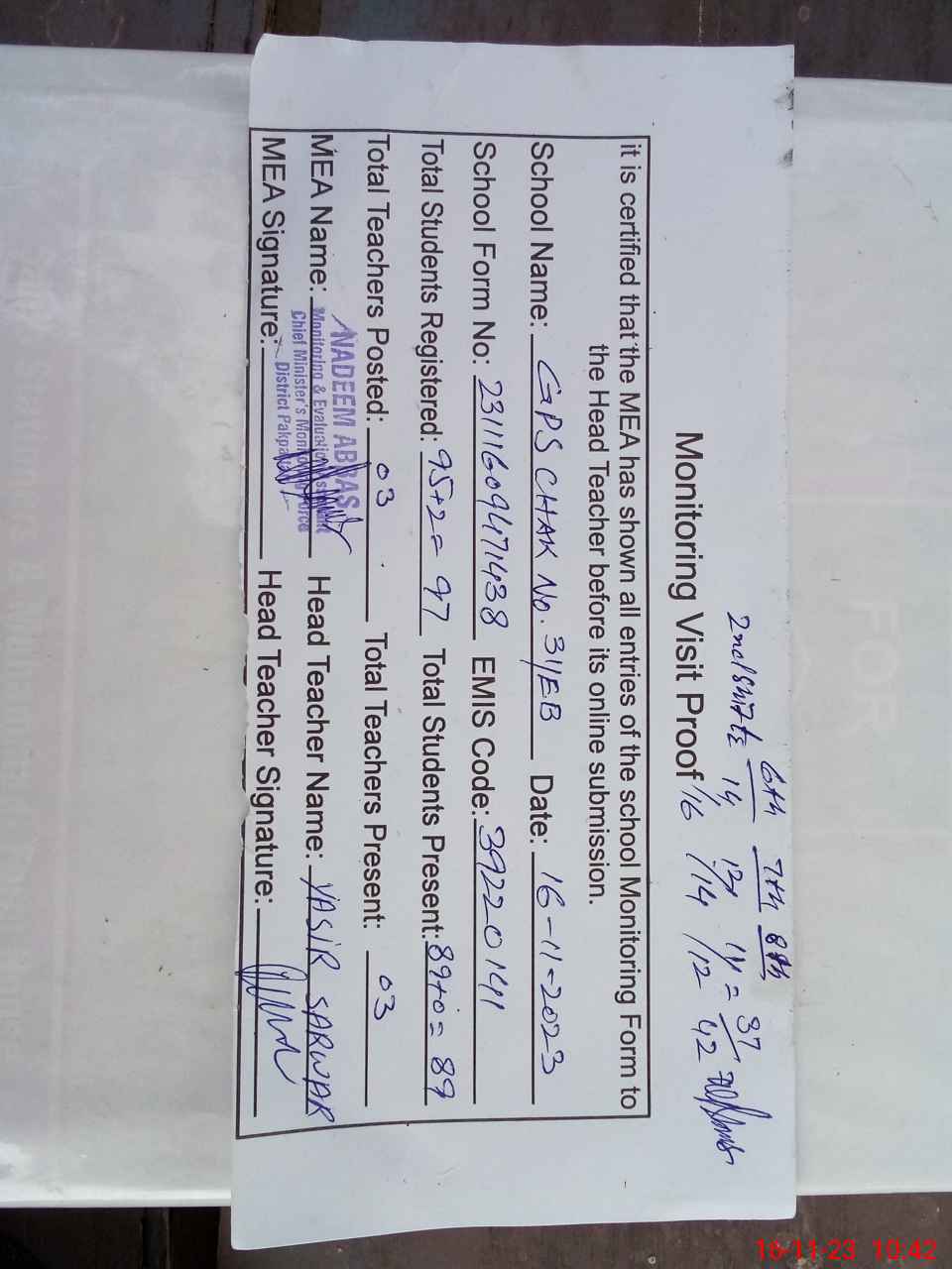 | Attendance Register | Head Teacher | MEA with School | Visit Proof |