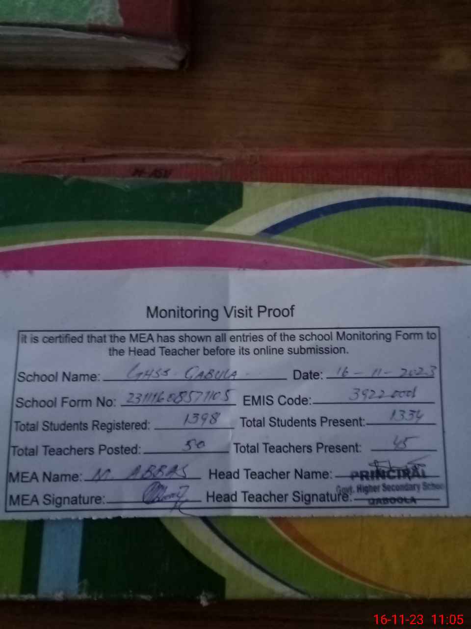 | Attendance Register | Head Teacher | MEA with School | Visit Proof |