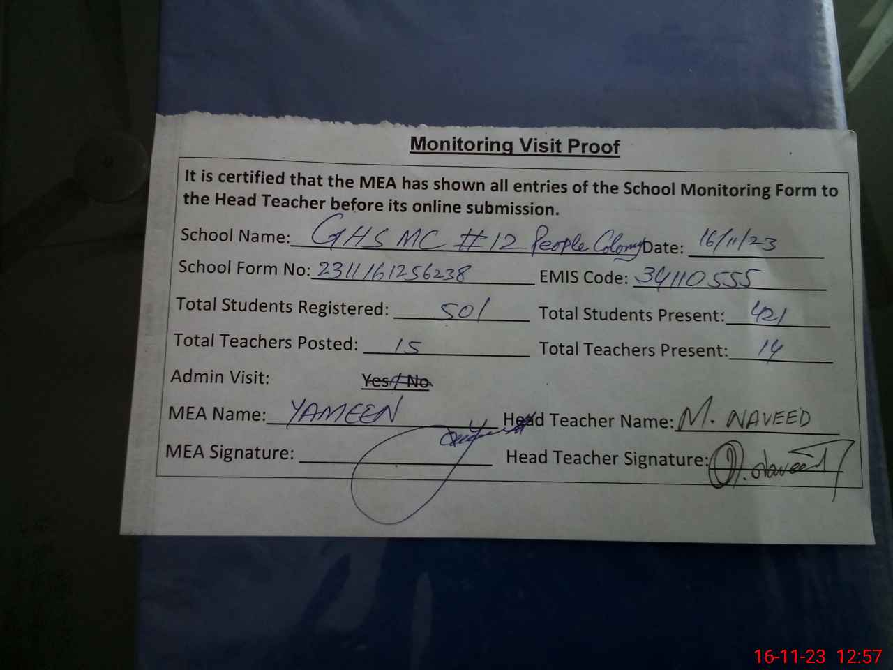 | Attendance Register | Head Teacher | MEA with School | Visit Proof |