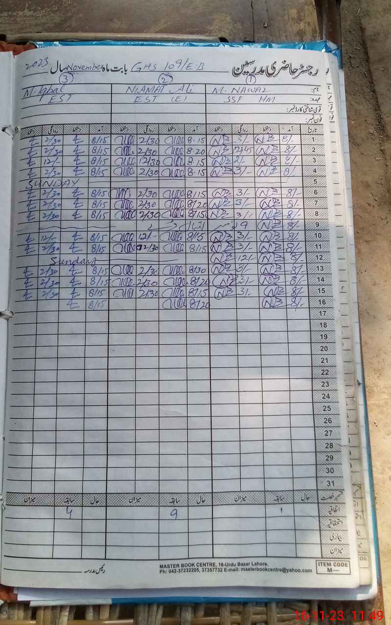 | CNIC | Full Name | Designation | R/C | Absence During Last Calender Month |
