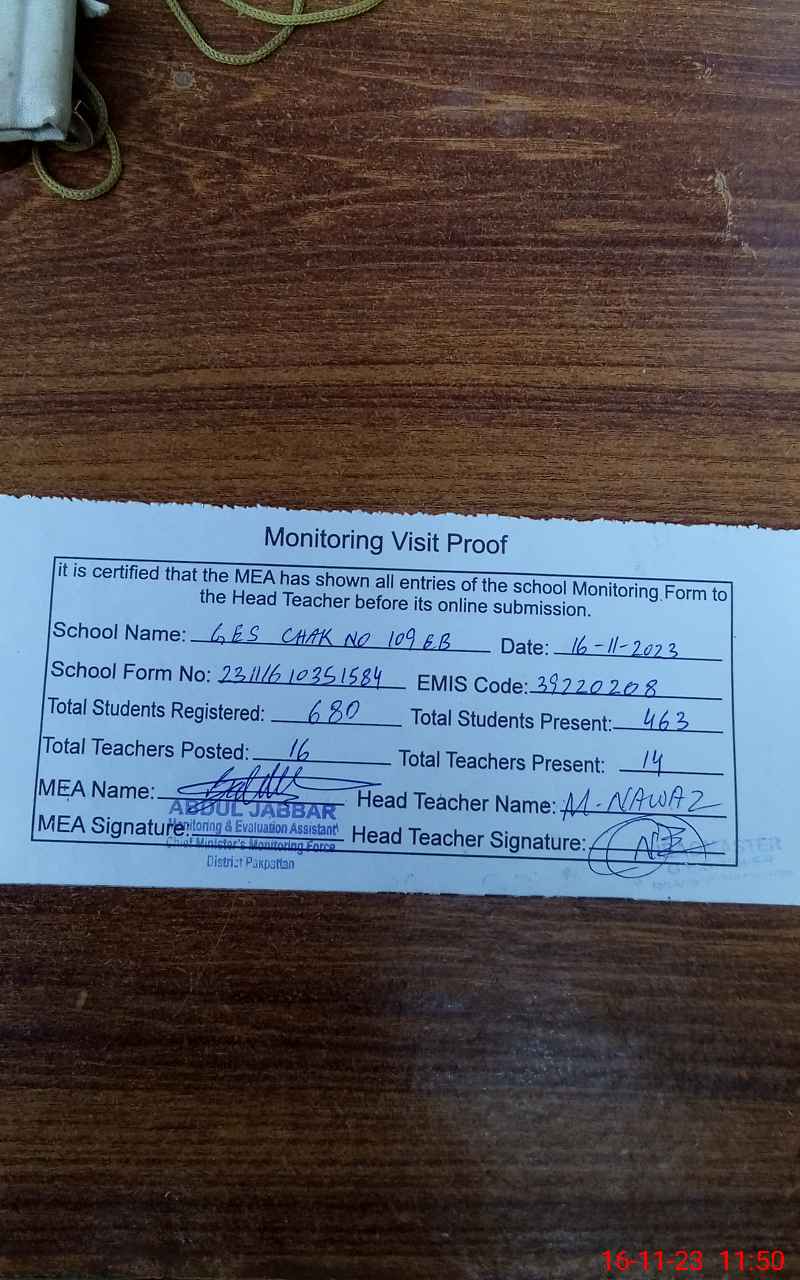 | EMIS Code: 39220208 | Name of School: GHS CHAK NO. 109/ EB | |||